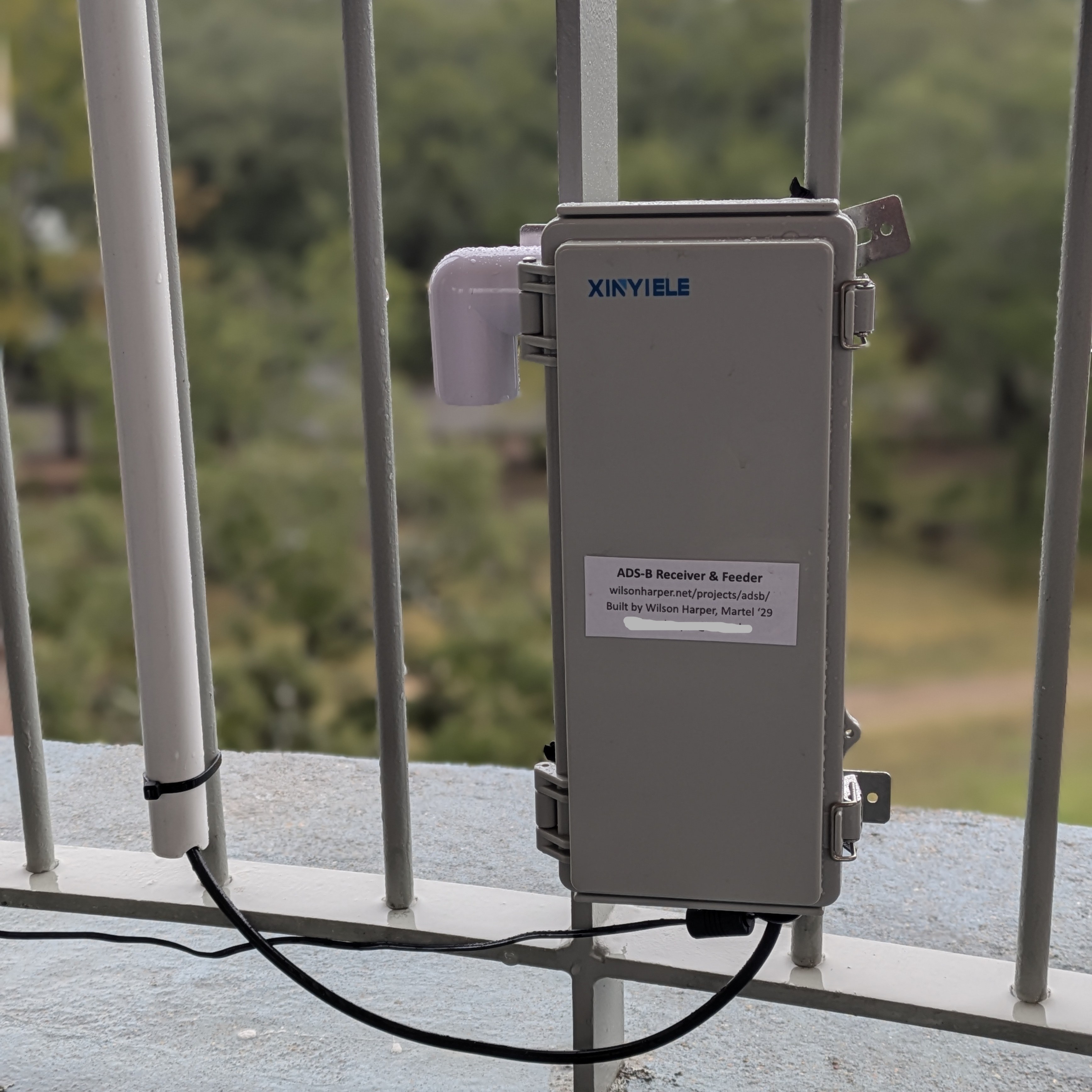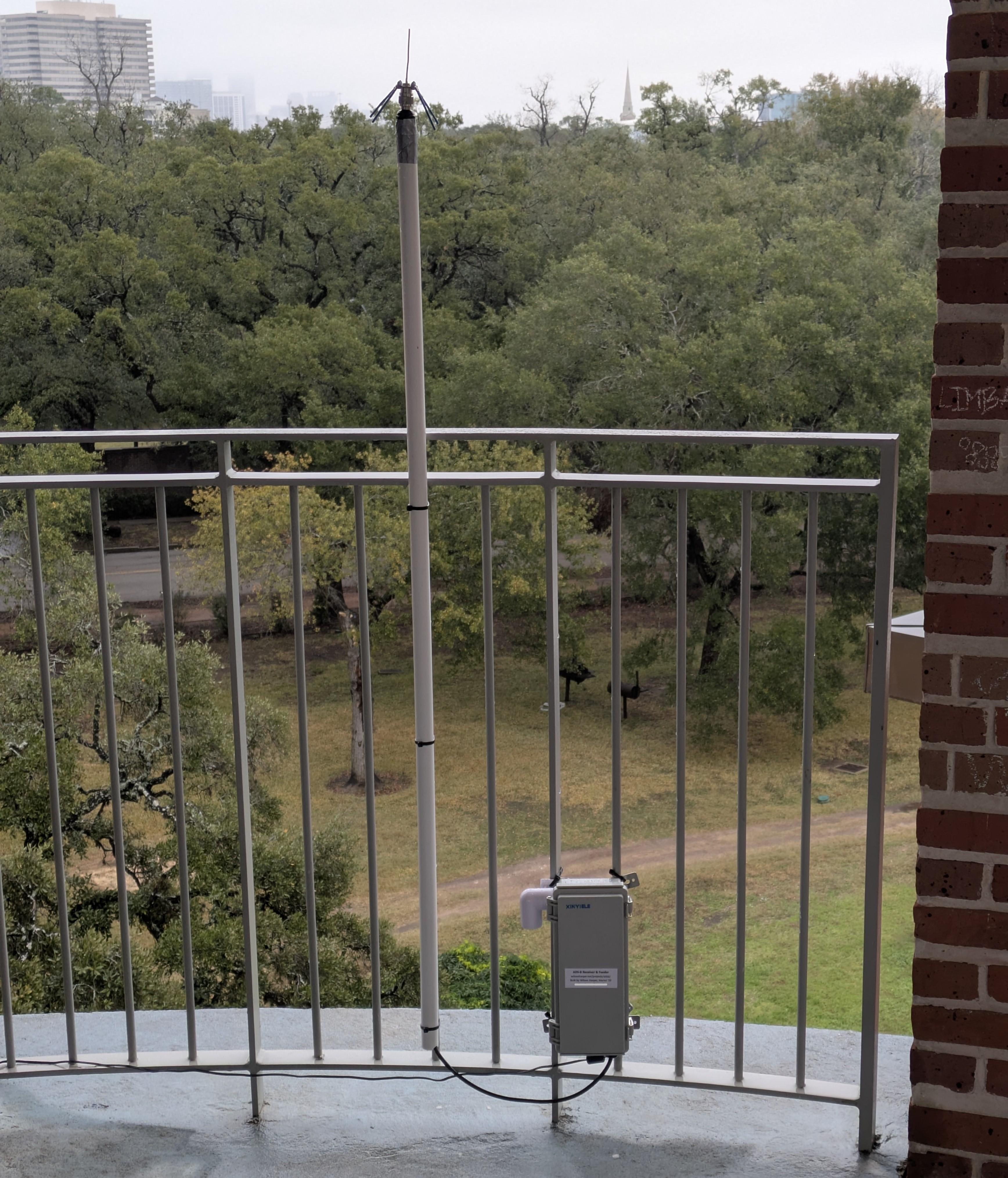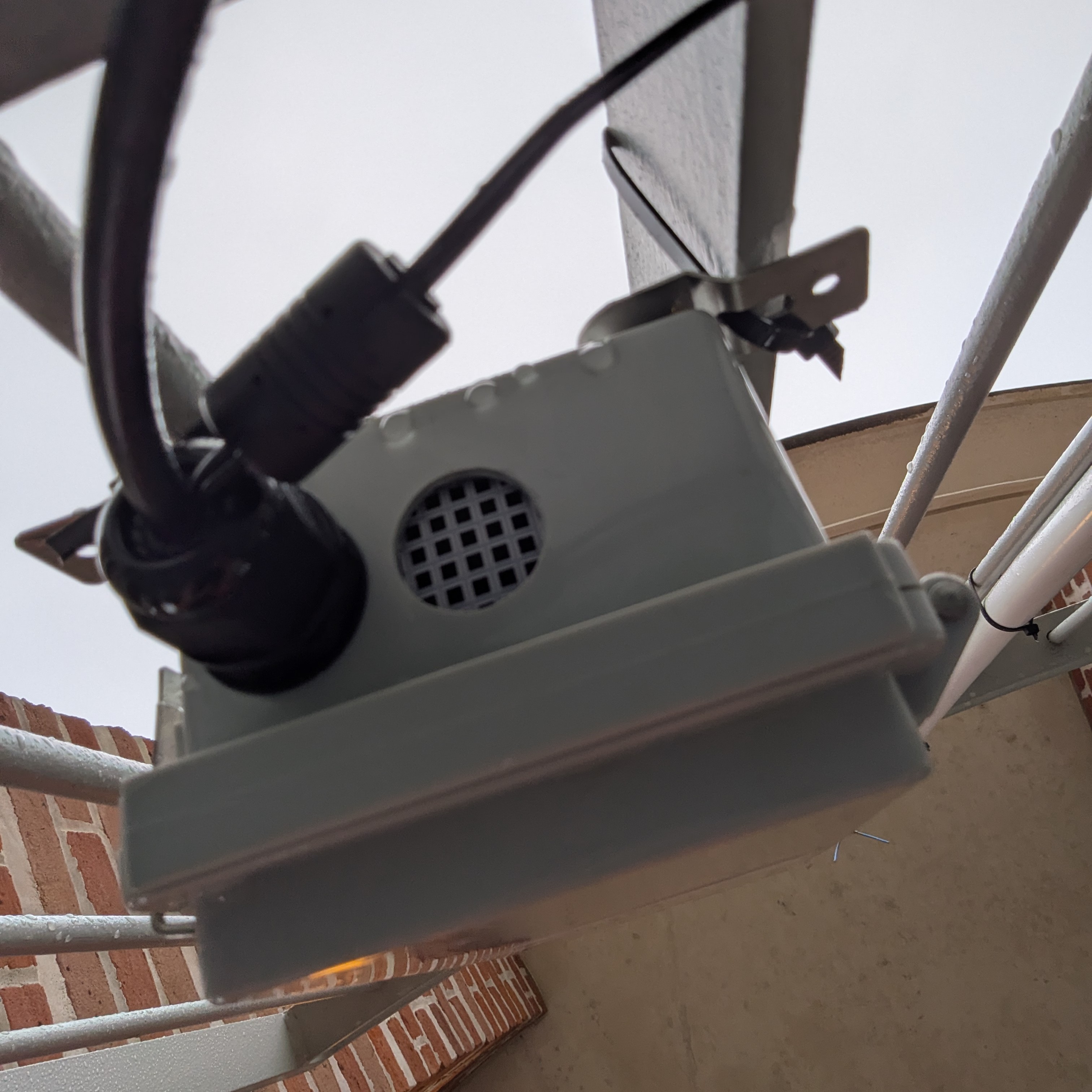 I attached the antenna to a cable gland, which I then attached to a 5’ PVC pipe. I mounted the box and pipe to the balcony’s railing.