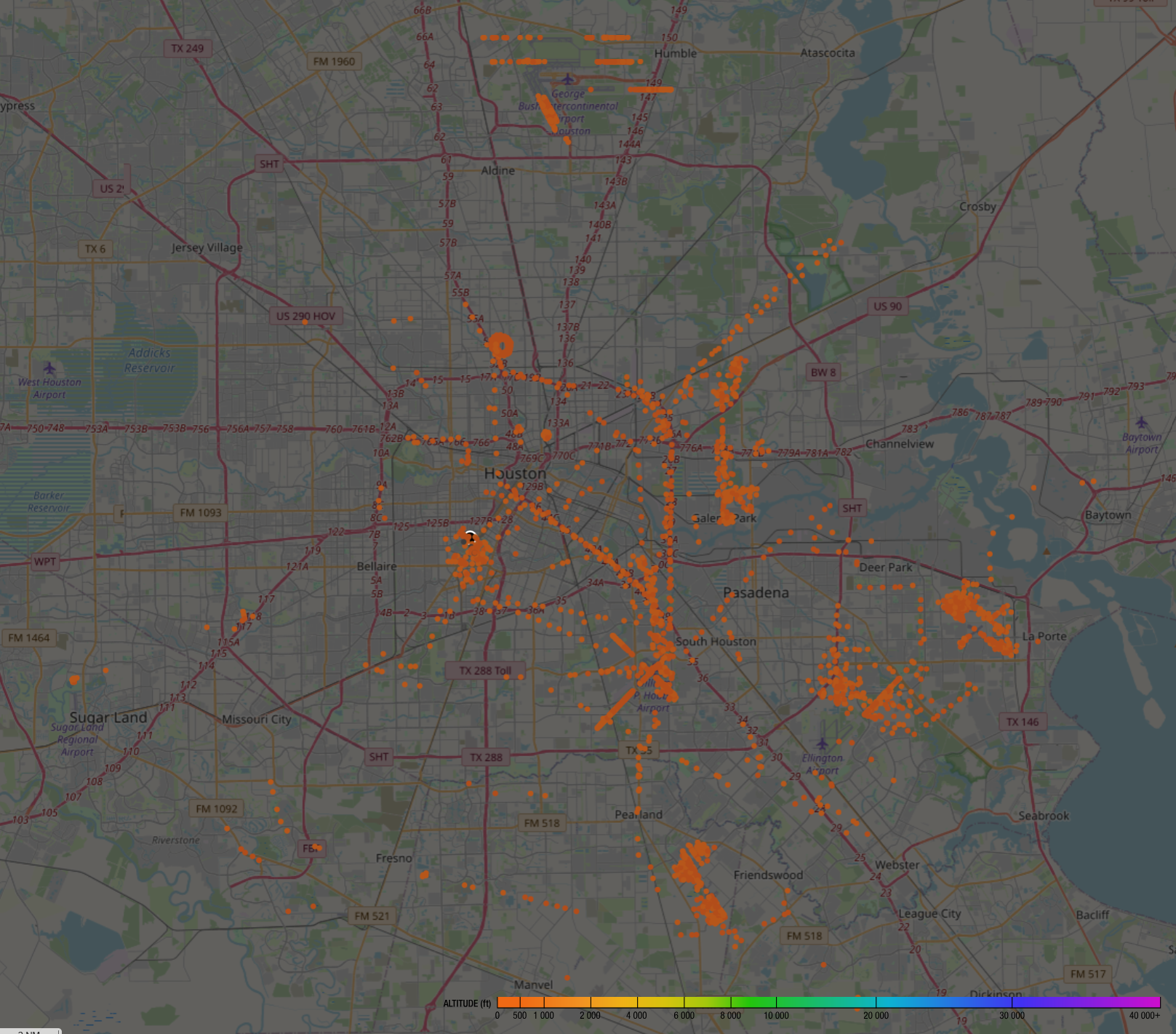 This is too much information to view at once. Luckily, it’s easy to filter. Let’s start by looking at flights at certain altitudes. Under 350’, we see mainly helicopters and airplanes landing at IAH, Hobby, Pearland, and a number of smaller airports I didn’t even know about.