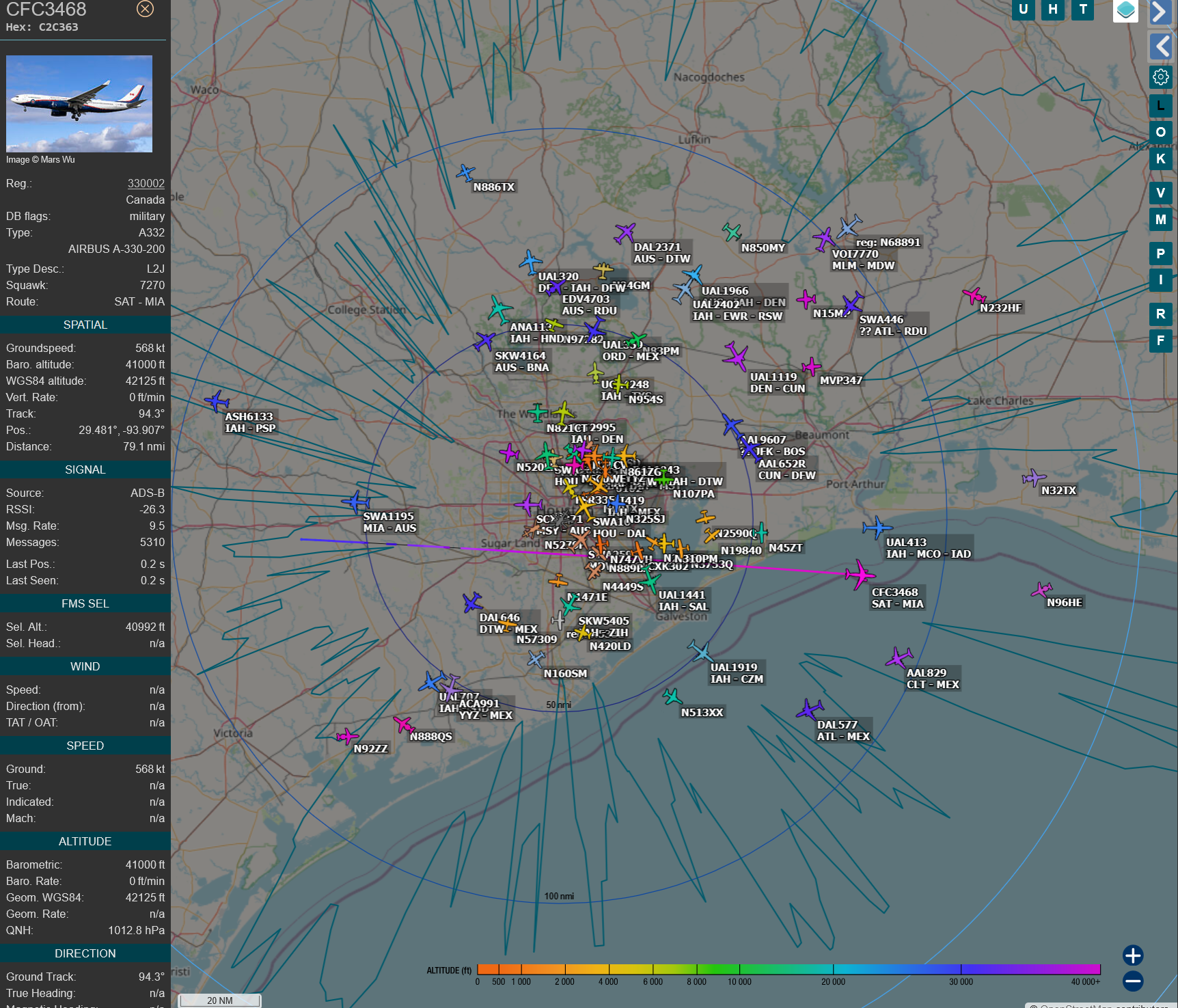 Filtering for military aircraft reveals more than I expected. There are plenty of small transport crafts, but I’ve also seen tons of NASA T-38s, a C-17, and a CC-330 Husky registered to the Royal Canadian Air Force.
