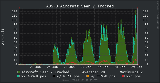 I also like keeping track of the actual number of aircraft tracked. It’s seen up to ~130 at once, and it’s clear that air traffic volume follows daily patterns.