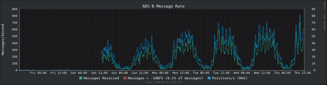With the old antenna and location, I was lucky to see over 5 messages per second. After relocating and upgrading the antenna, I saw as high as 750–over two orders of magnitude greater! I am writing this after the January 2026 North American winter storm, and it seems air traffic numbers are still returning to typical levels.