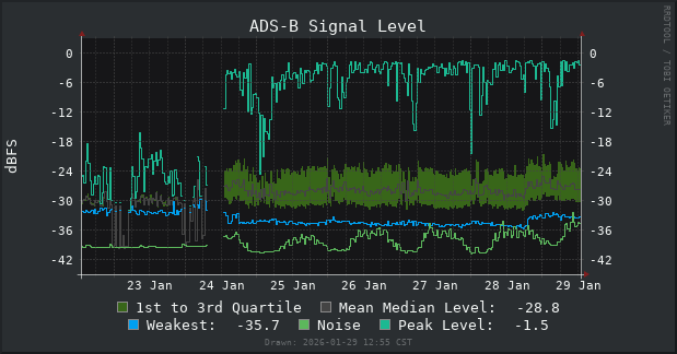These two graphs above might be my favorite of the bunch because the difference between antennas/locations is so stark. RSSI (signal strength) has increased across the board. The strongest signals are as high as -1.5 dB, and the noise floor hasn’t appreciably increased. The -1.5 dB peaks suggest the SDR is clipping. While readsb’s autogain is enabled, the V4’s LNA might be too aggressive for the new antenna. I likely need to manually reduce gain.
