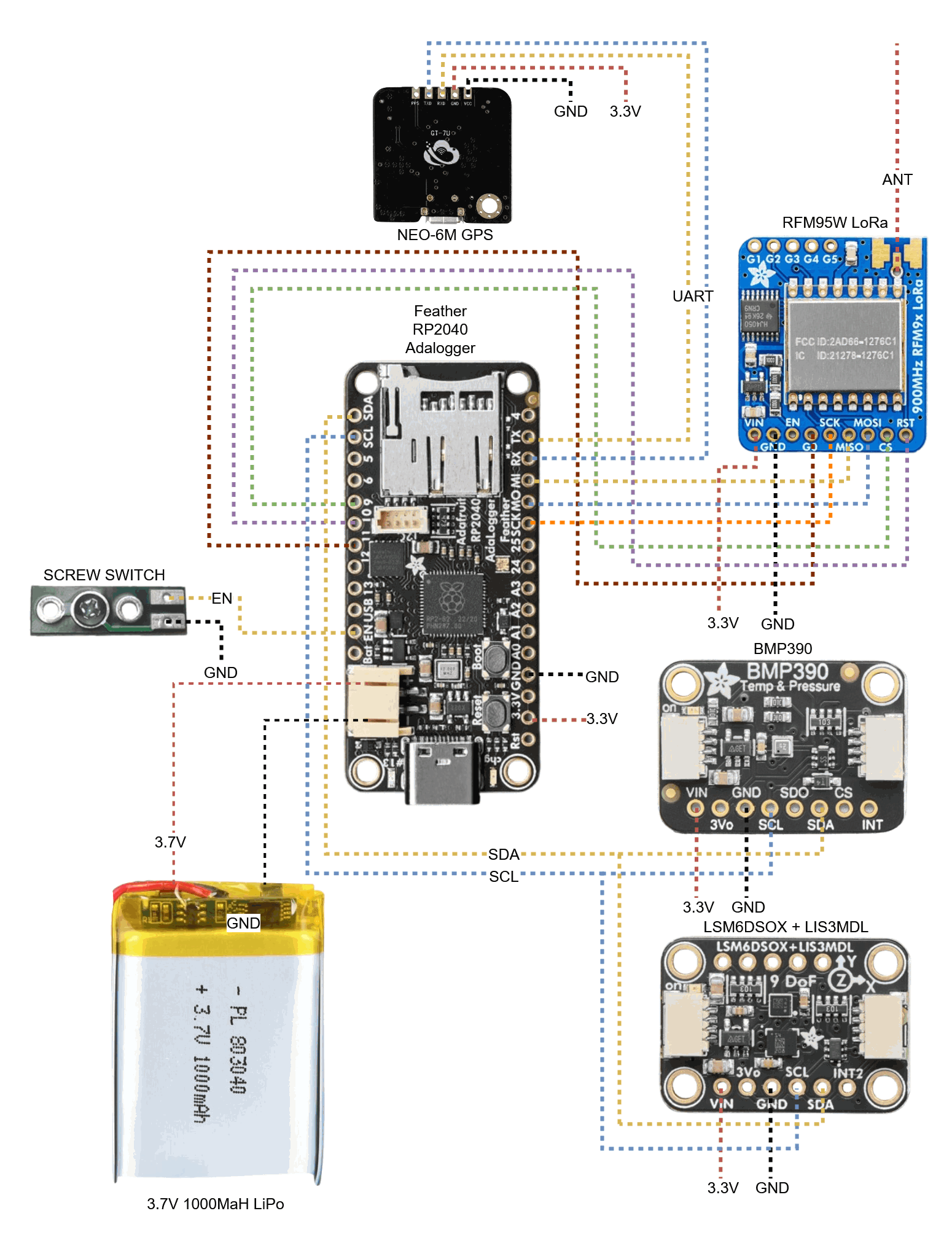 An IMU combo. While I only used the LSM6DSOX accelerometer, I plan to enable the LIS3MDL magnetometer in the future for full 9-degree tracking. This board also uses I2C. - NEO-6MV2 GPS