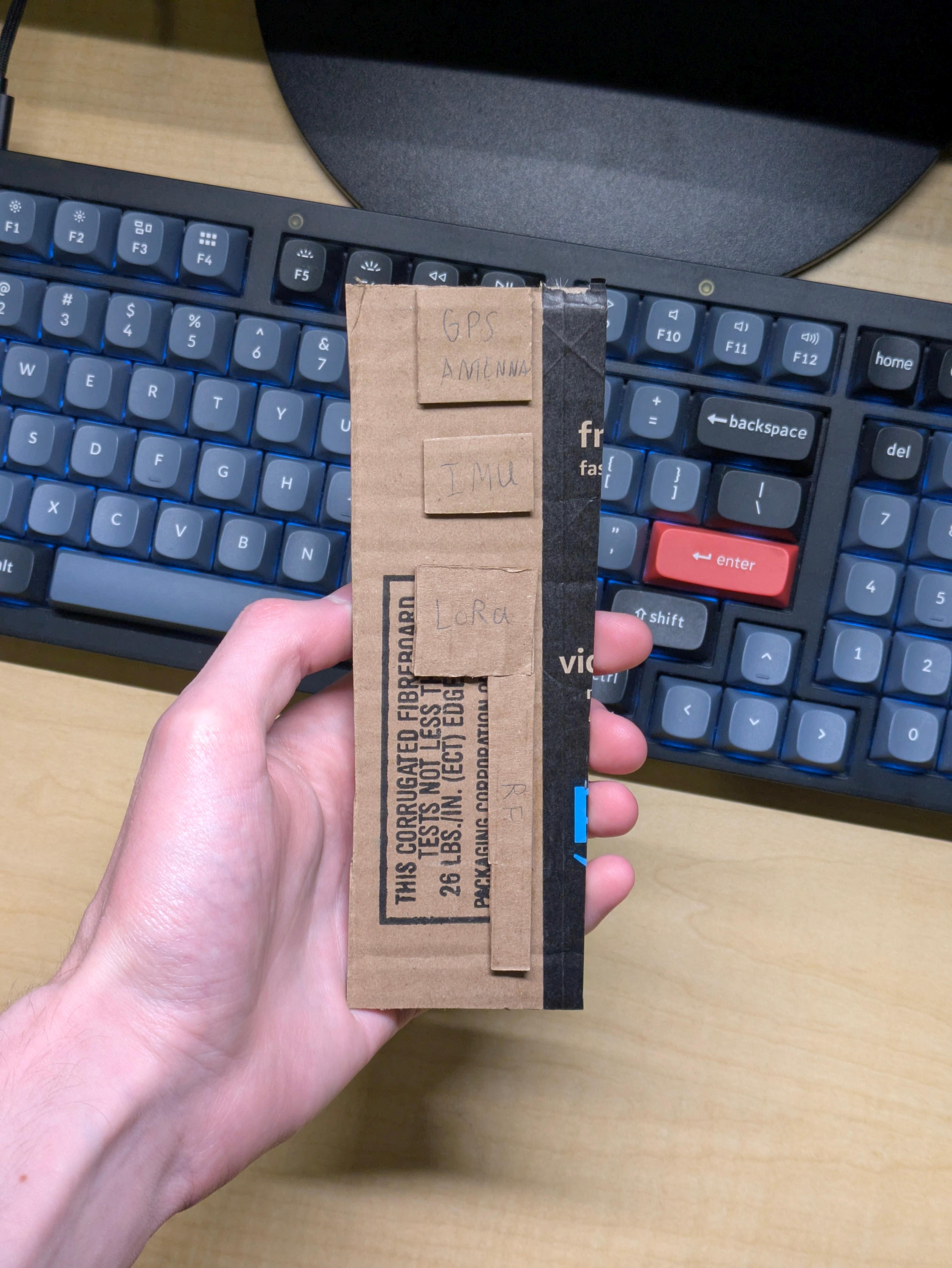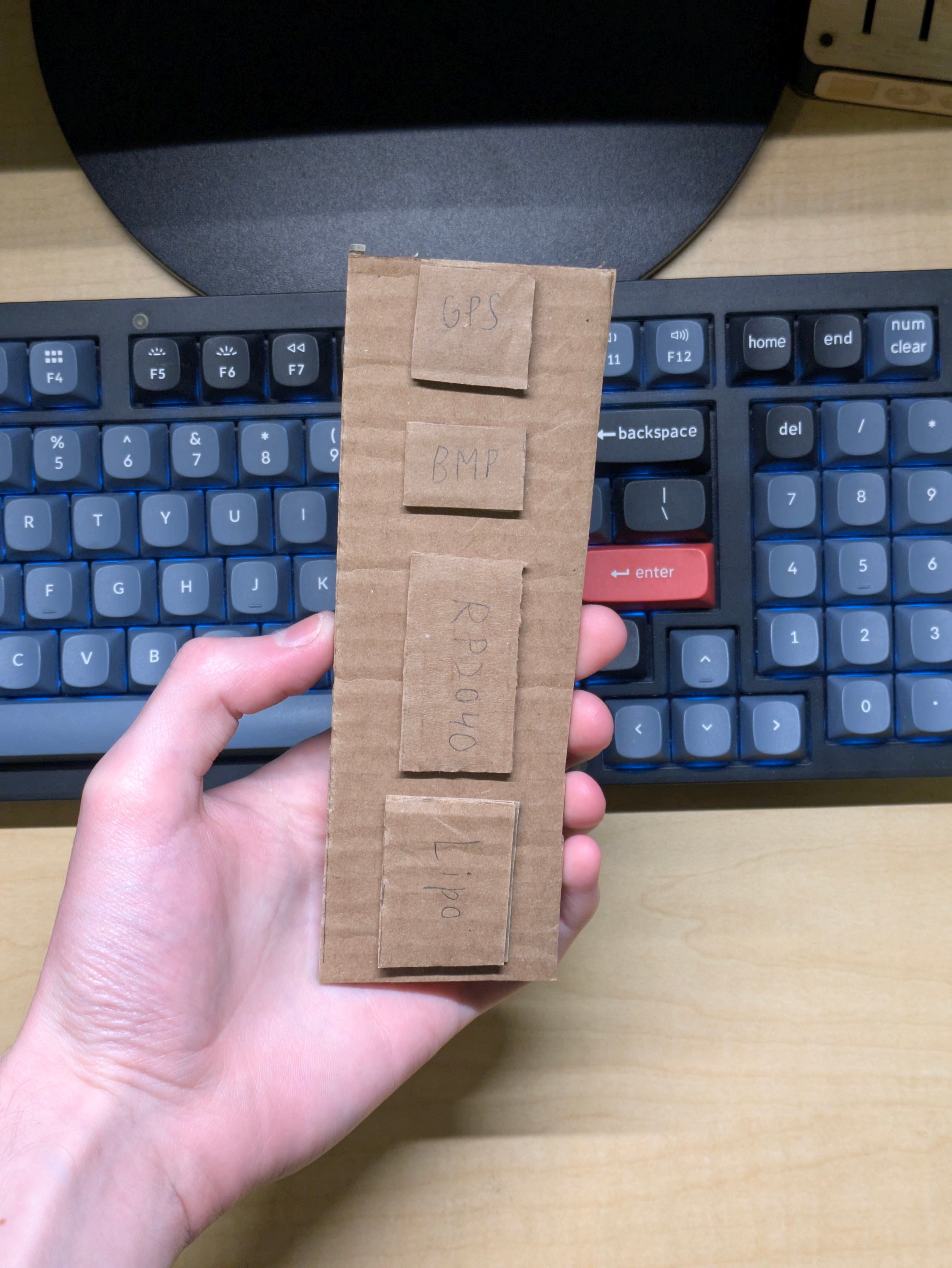 I wanted to get a sense of space in the real world before I dove into any CAD. Because I had just two weeks and the boards hadn’t arrived yet, I used the next best thing–cardboard!I cut each piece to its actual size and assembled them on a “sled.” This first design had surprising longevity.
