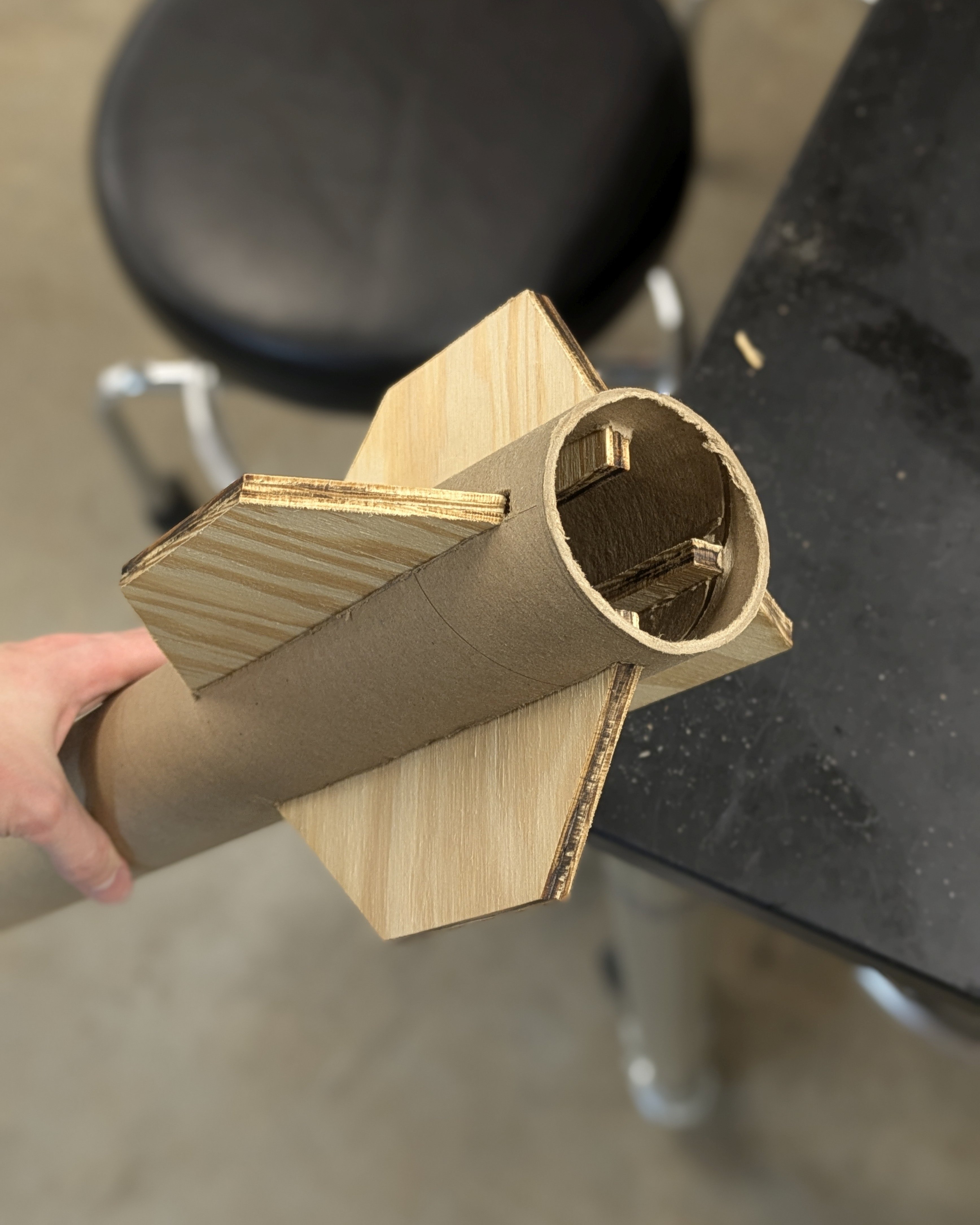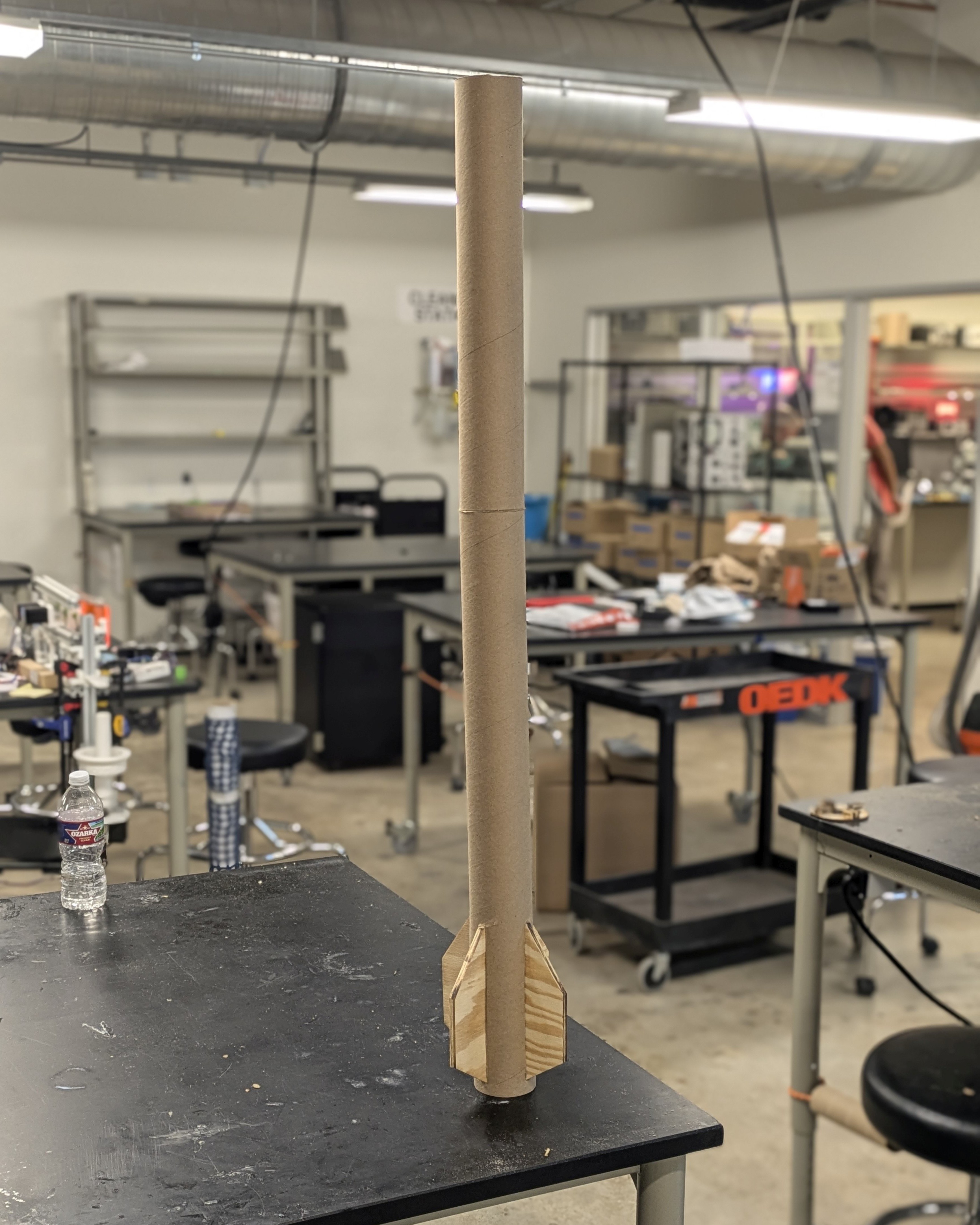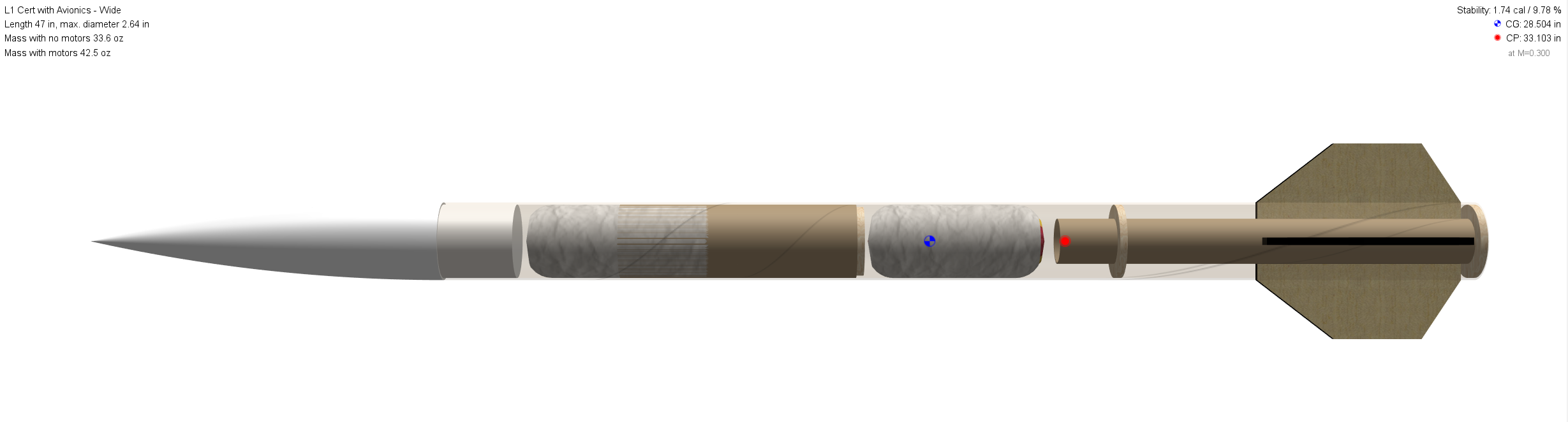You can find the OpenRocket model here. The rest of the design was simpler. The body tubes are heavy-duty cardboard, and the fins are laser-cut plywood. The nosecone is 3D-printed PLA. The rest is lots of epoxy, haha.