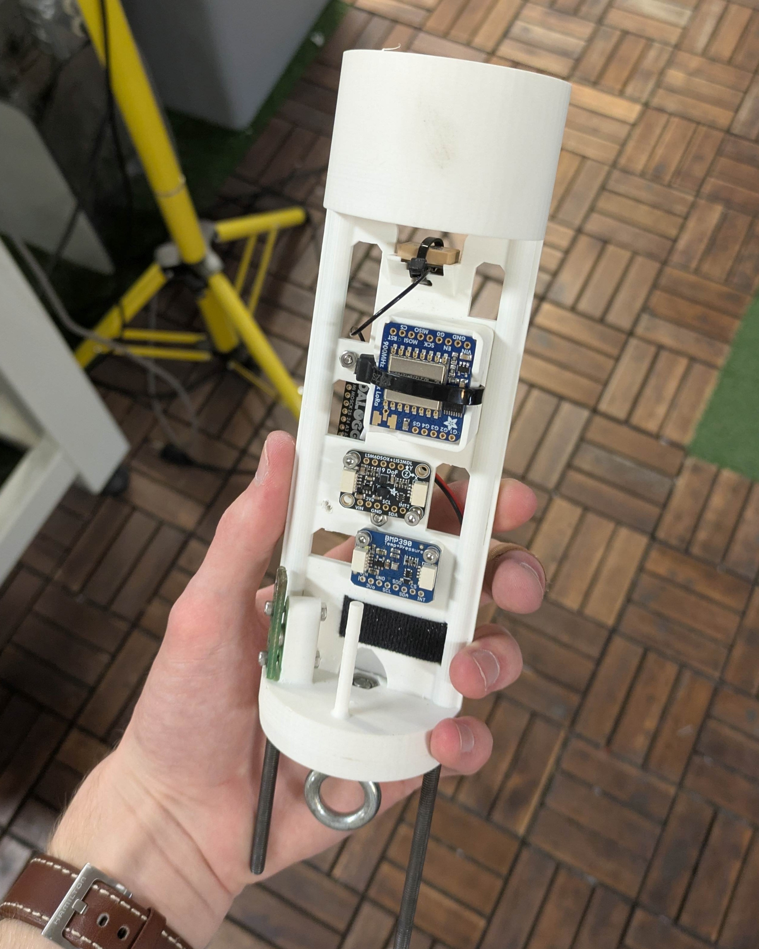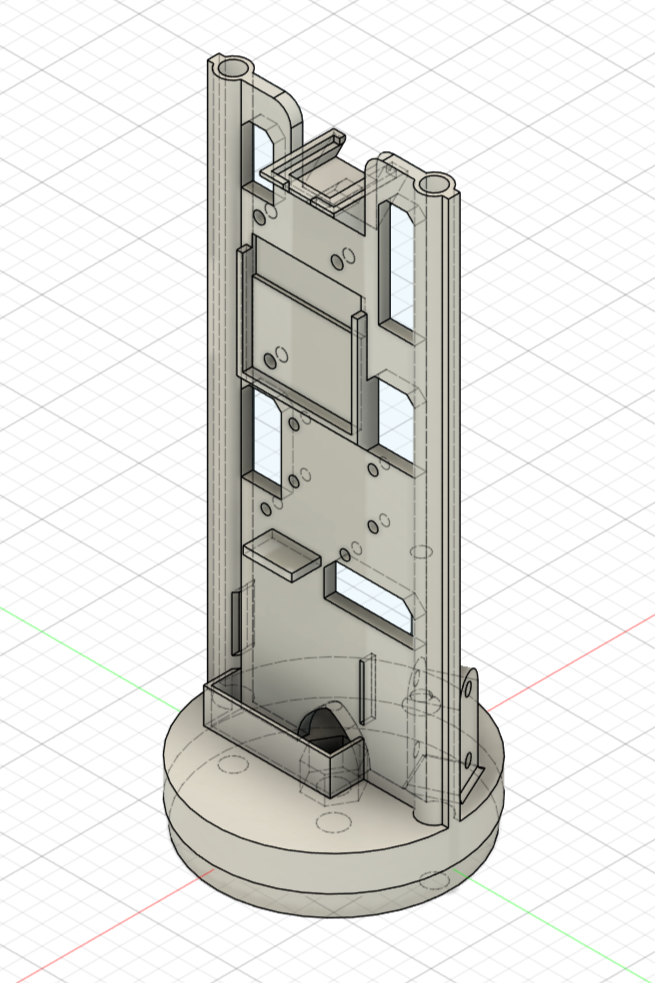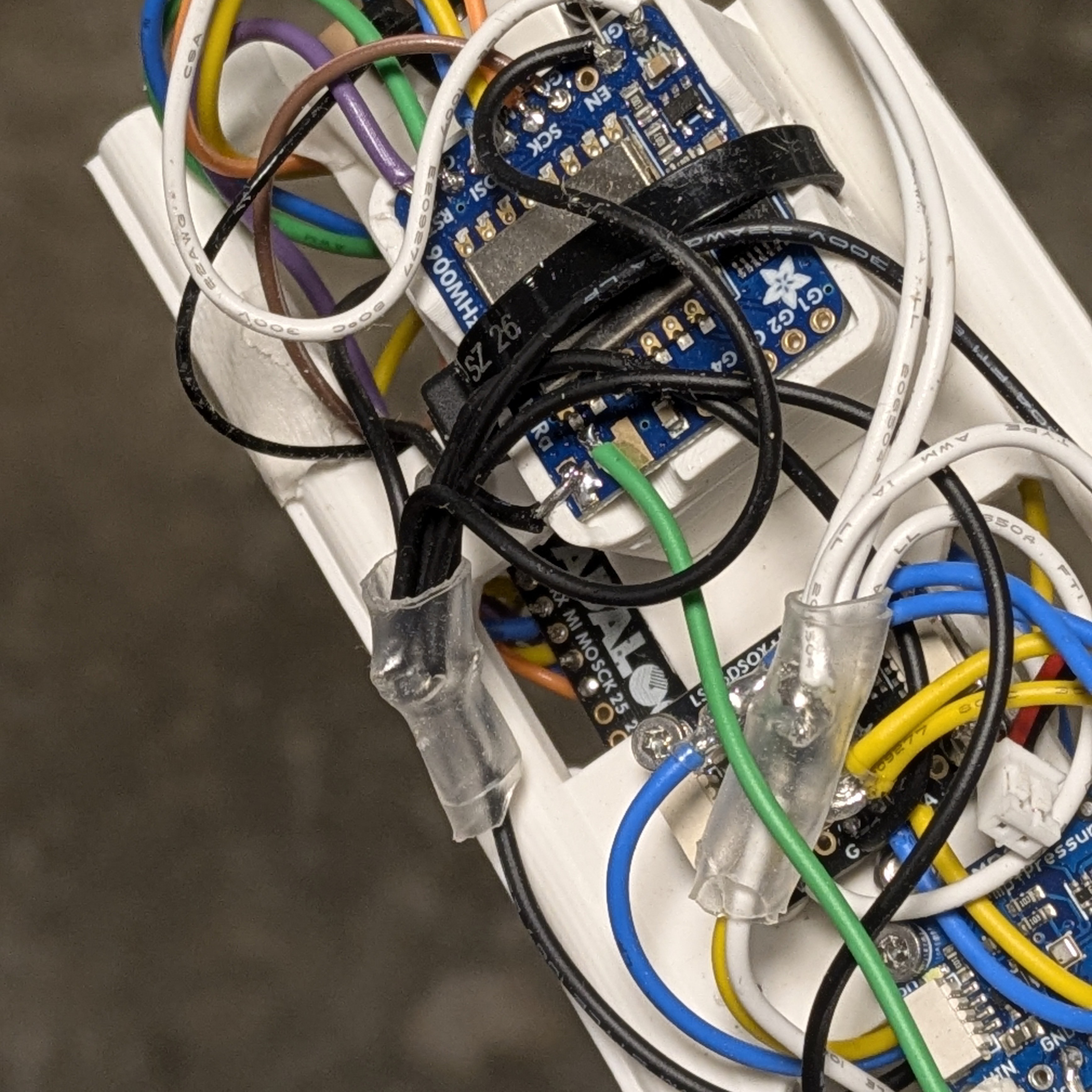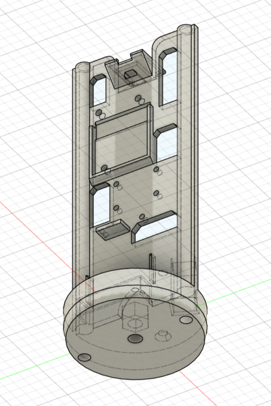 After that first design, I did some actual CAD. Big thanks to Ian Hsieh for helping out. In terms of component placement, I knew the GPS antenna would need to be away from noisy or RF-opaque materials. Similarly, the 915 MHz LoRa antenna needed to be away from the two M5 threaded rods to avoid shielding and unpredictable reflections. The accelerometer/magnetometer also needed to be away from large metal objects and high-current wires.