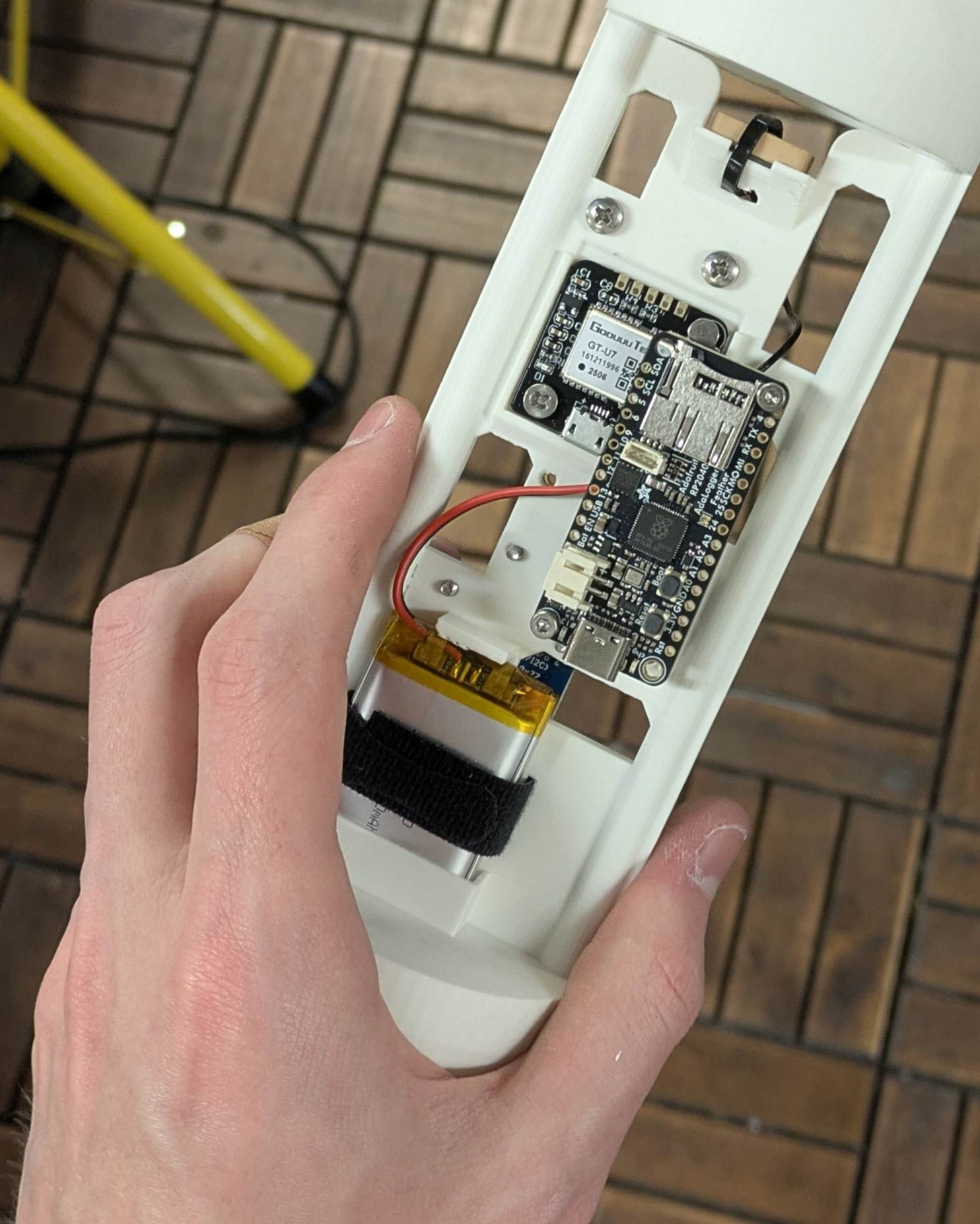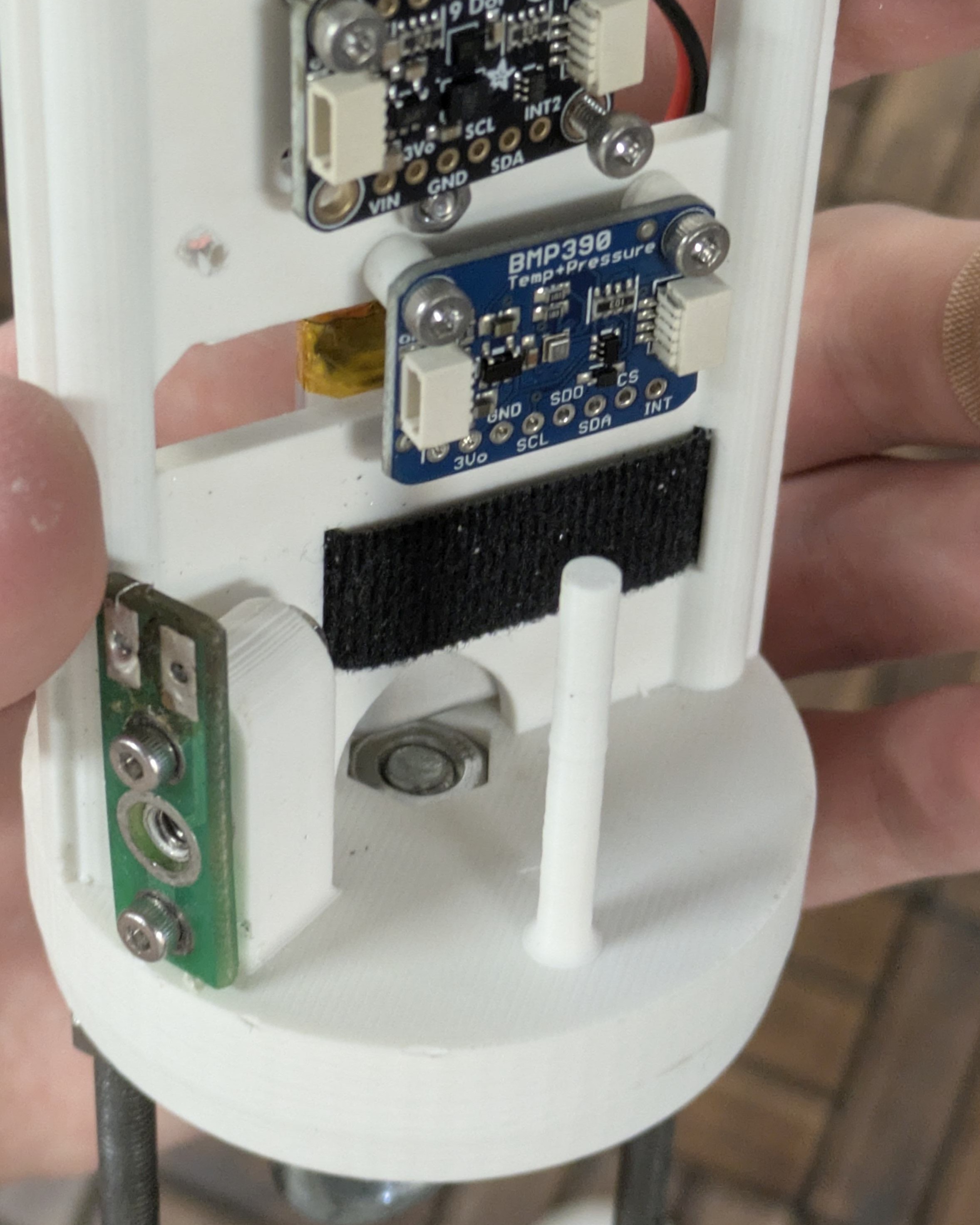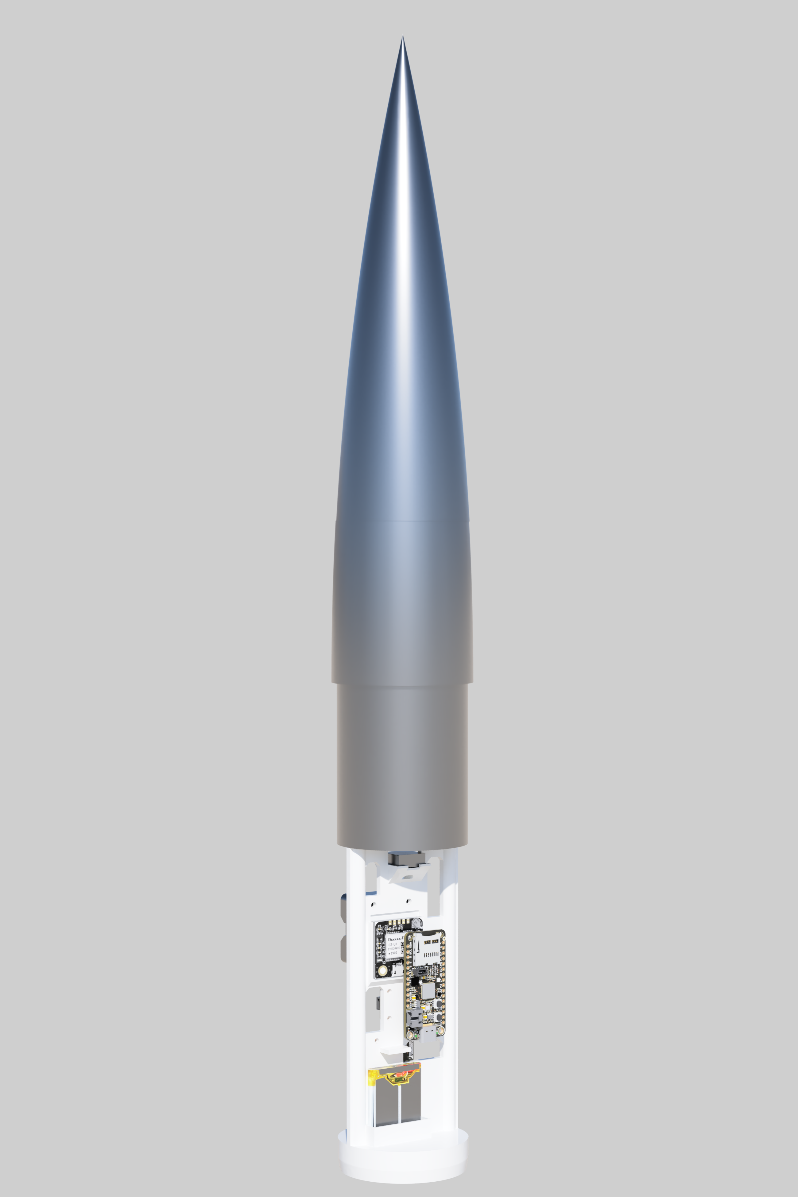 Notice that the GPS antenna (tan plastic and metal) is at the very top to avoid shielding. The battery has its own section because it naturally doesn’t have any attachment points. The screw switch protrudes a bit, but there was enough space for everything to slide in and out of the body tube.