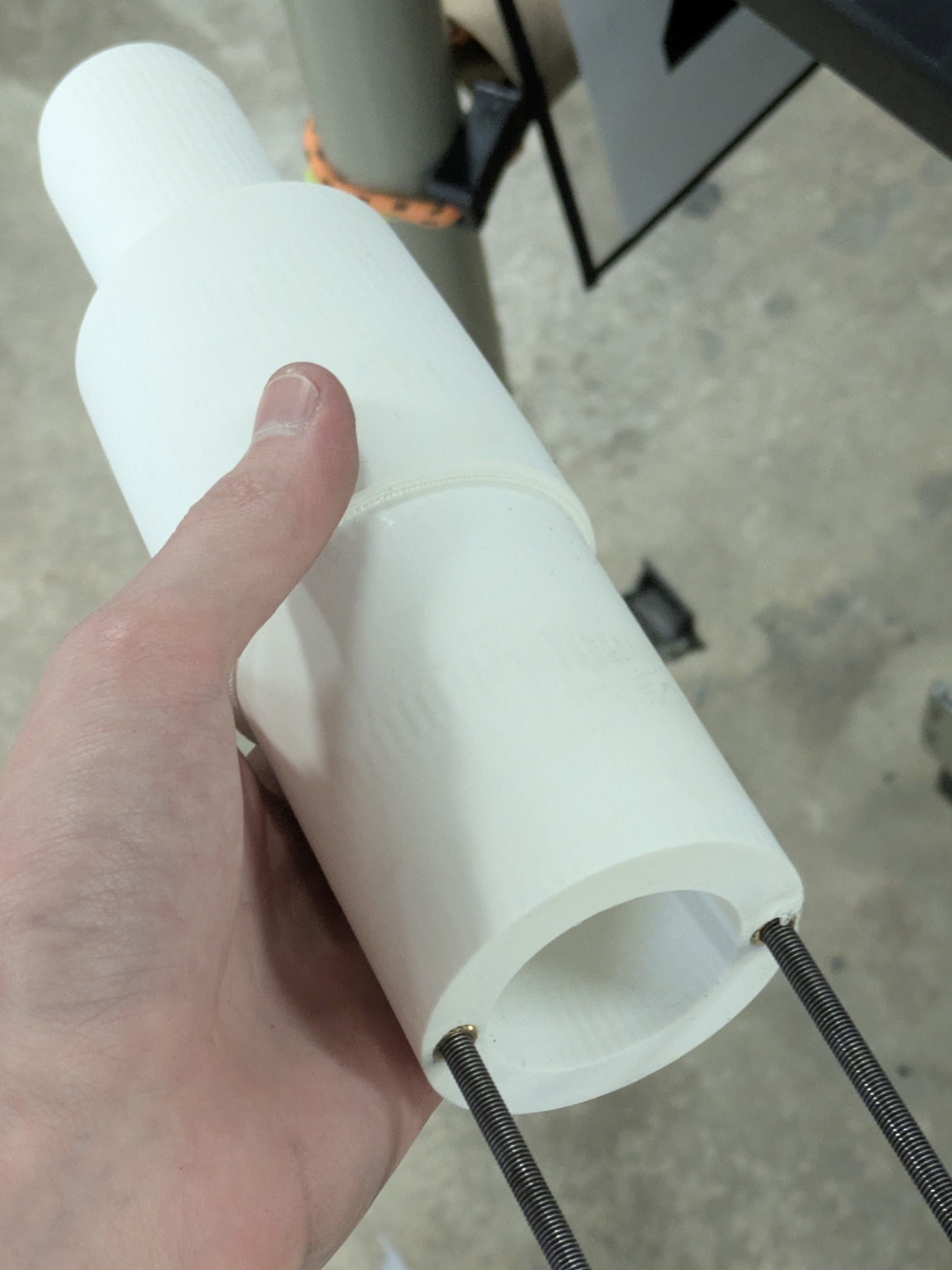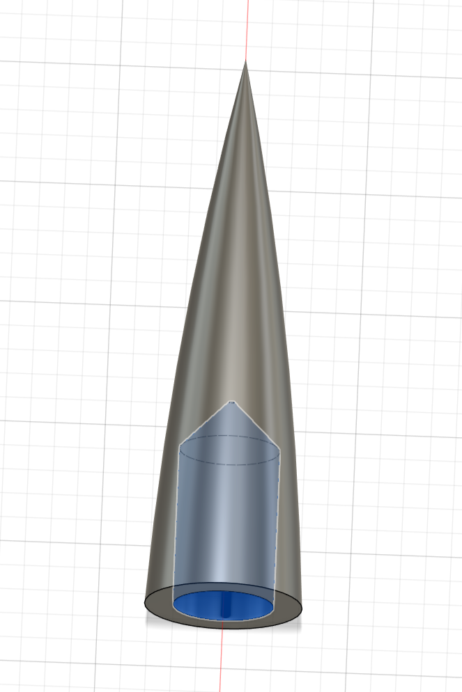 Because I needed a clean way to slide the avionics bay in and out of the upper body tube, I decided to make it slide onto threaded rods that are directly attached to the nose cone. Additionally, the top of the nose cone slides onto the base where it is epoxied in place.