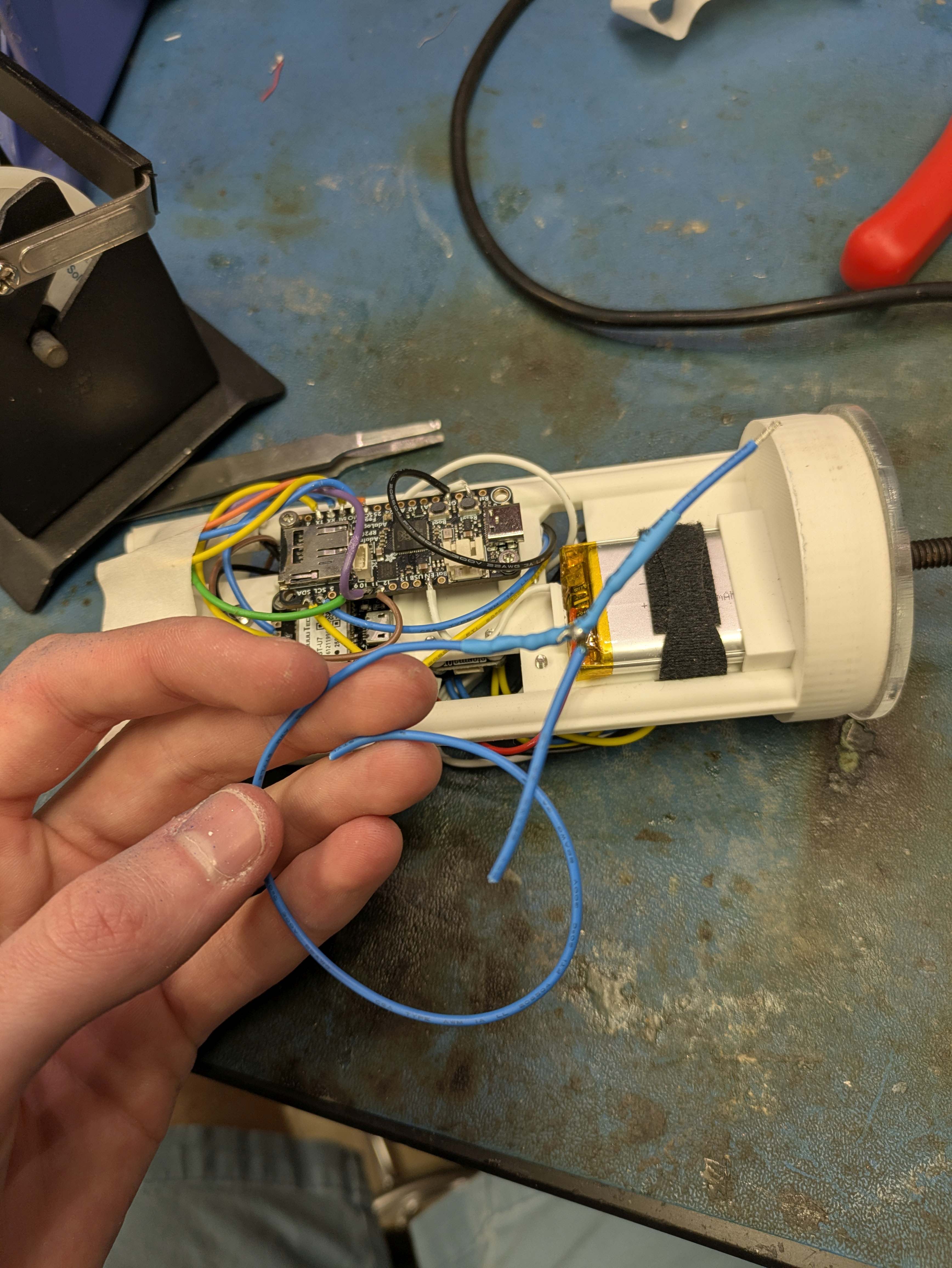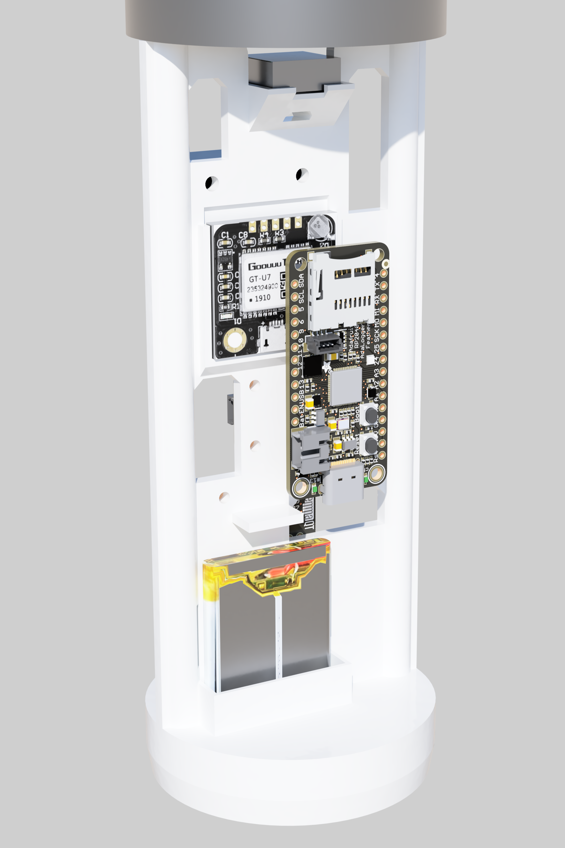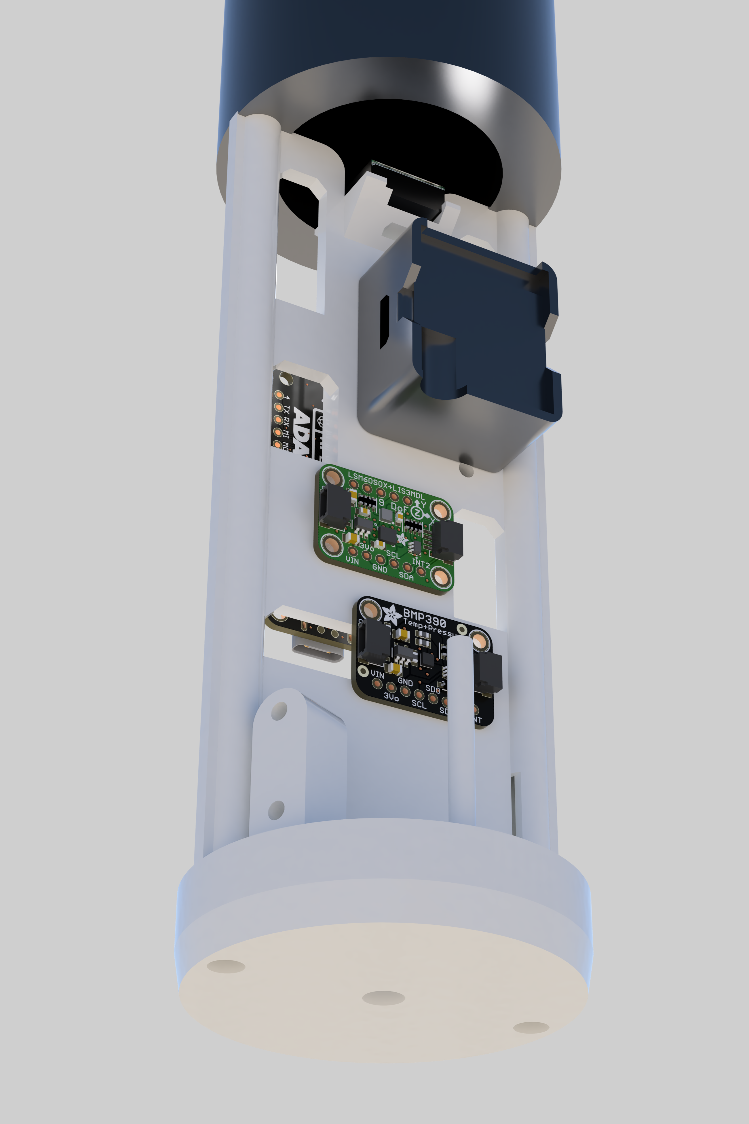 Finally, I put all the components in the model to ensure everything was the right size. The tight timeline impacted how pretty the renders are and my ability to include things like the LoRa antenna, the screw switch, etc. in the CAD.