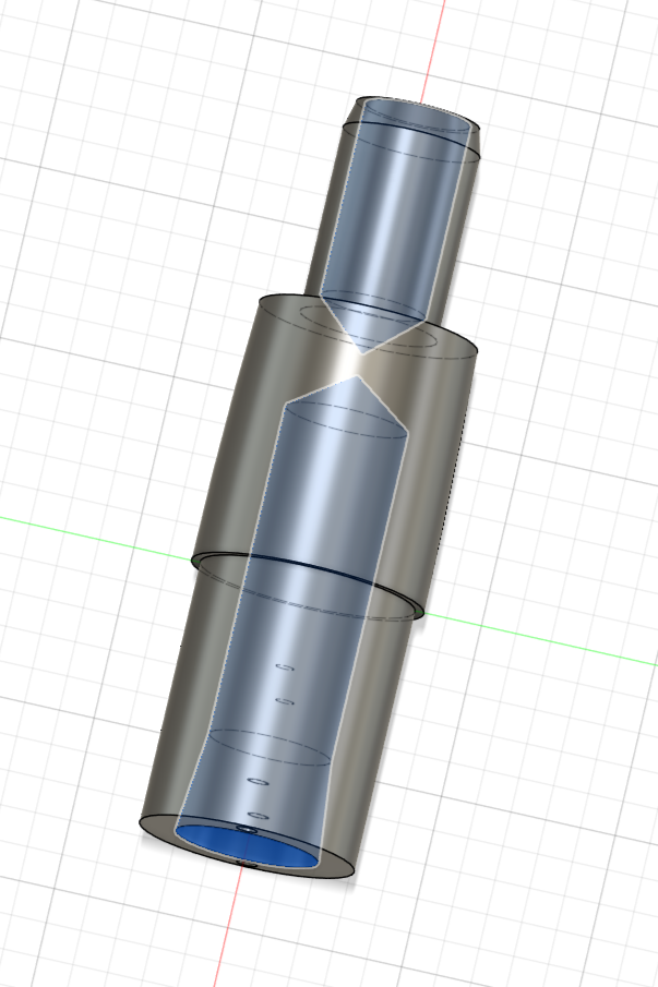 Overstability increases the rocket’s predisposition to weathercocking–pitching into the wind. My rocket model was overstable because the flight computer put so much mass toward the nose of the rocket. The solution? Make the rocket as short as possible. Instead of using a typical coupler, I realized I’d need to create a system that combines the nose cone, upper body tube, and coupler into one solid unit. Yep, in the below model, the mass component is clipping into the coupler–that’s the design!