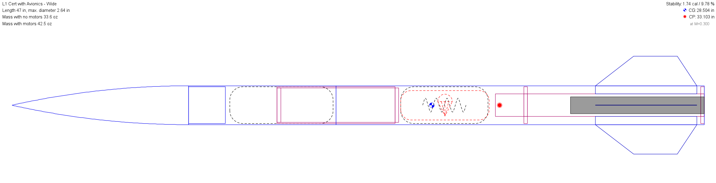 The first step was deciding the rocket’s basic specifications. I immediately knew I wanted the space that two body tubes would provide. A body diameter of 2.6” provides enough space without lowering the apogee. I modeled it in OpenRocket and realized stability would be a challenge–not because it would be unstable, but because it’d be overstable. The stability margin depends on the center of gravity, the center of pressure, and the rocket’s diameter. Ideally, the stability margin should be between ~1.3 and ~2, and a rocket with a stability margin over ~2.3 is considered overstable. My initial model had a stability margin of ~2.7.